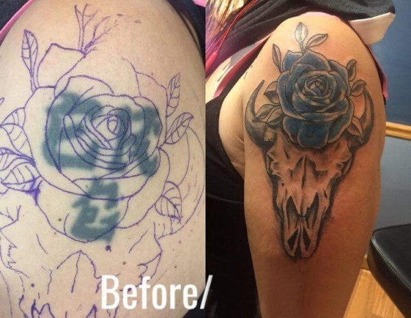 纹身覆盖 男生大臂上花朵和牛头纹身图片