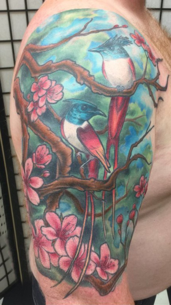 纹身鸟 男生手臂上文艺花朵纹身鸟图片