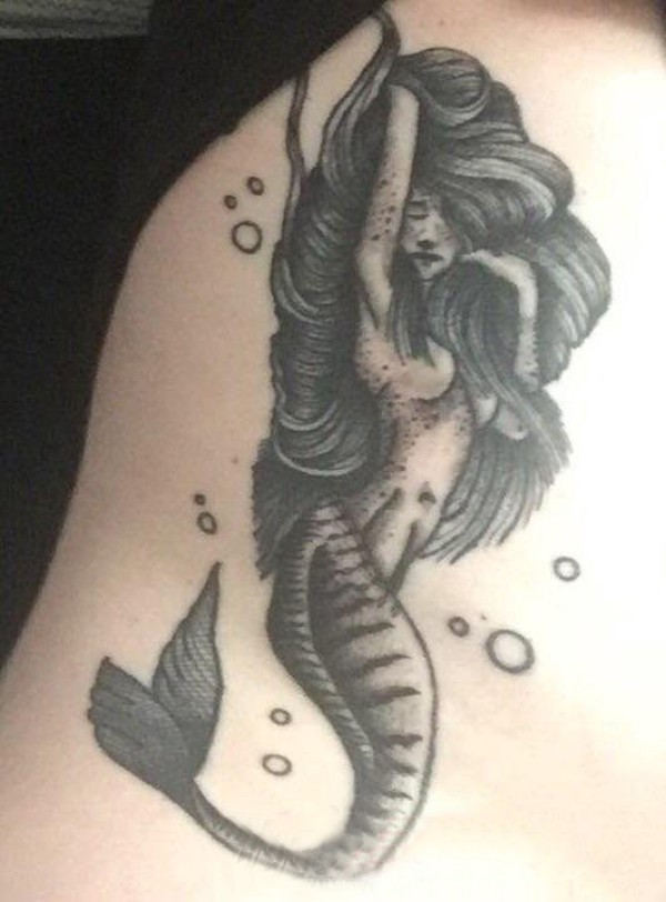 纹身美人鱼图案 女生后背黑灰纹身美人鱼图案