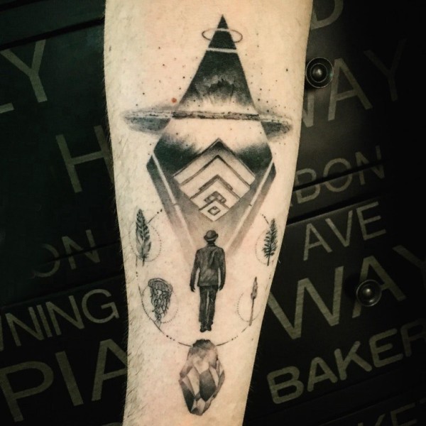 手臂纹身素材 男生手臂上黑色的人物和飞碟纹身图片