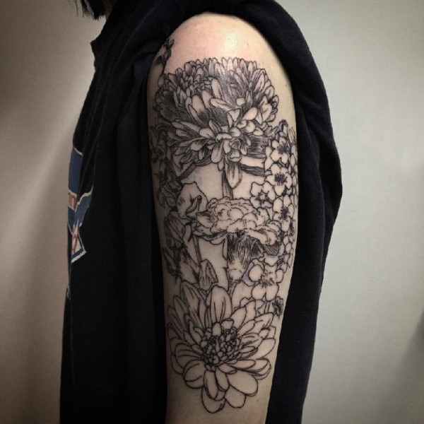 花朵纹身 男生手臂上简单线条纹身花朵图片