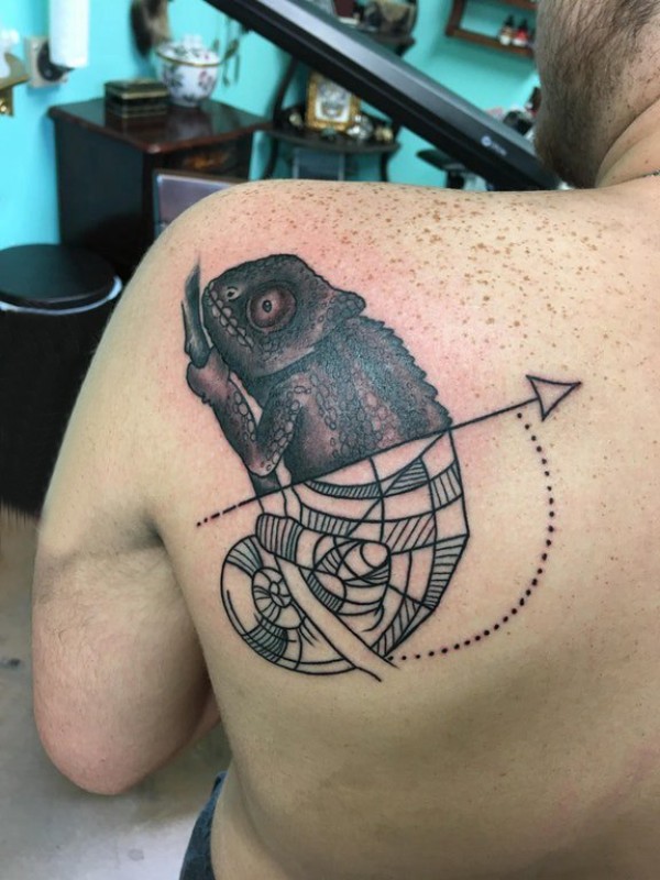 百乐动物纹身 男生后肩上黑色的变色龙纹身图片