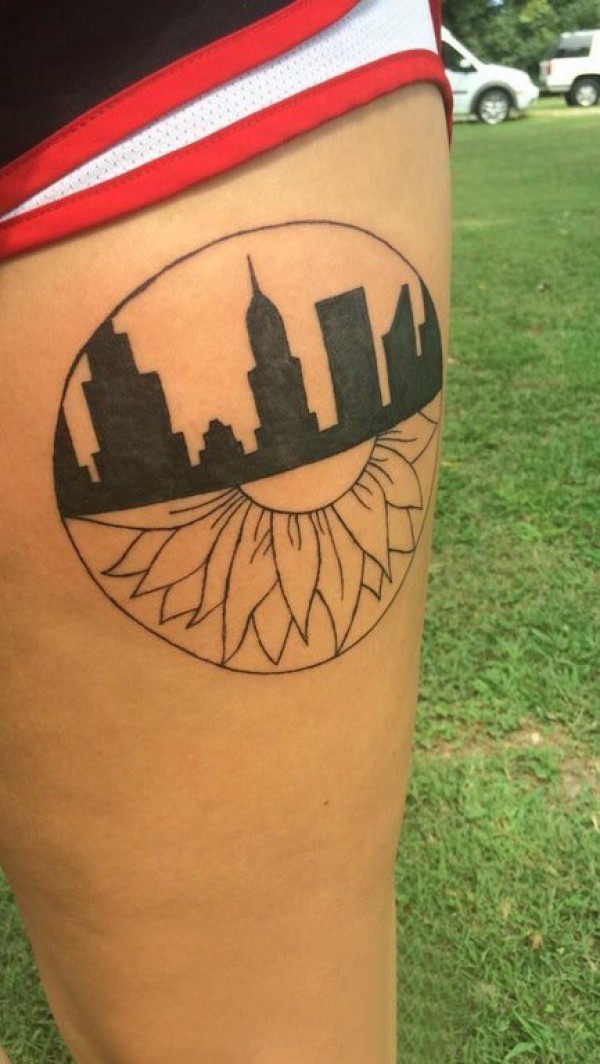 大腿纹身传统 女生大腿上建筑物和向日葵纹身图片