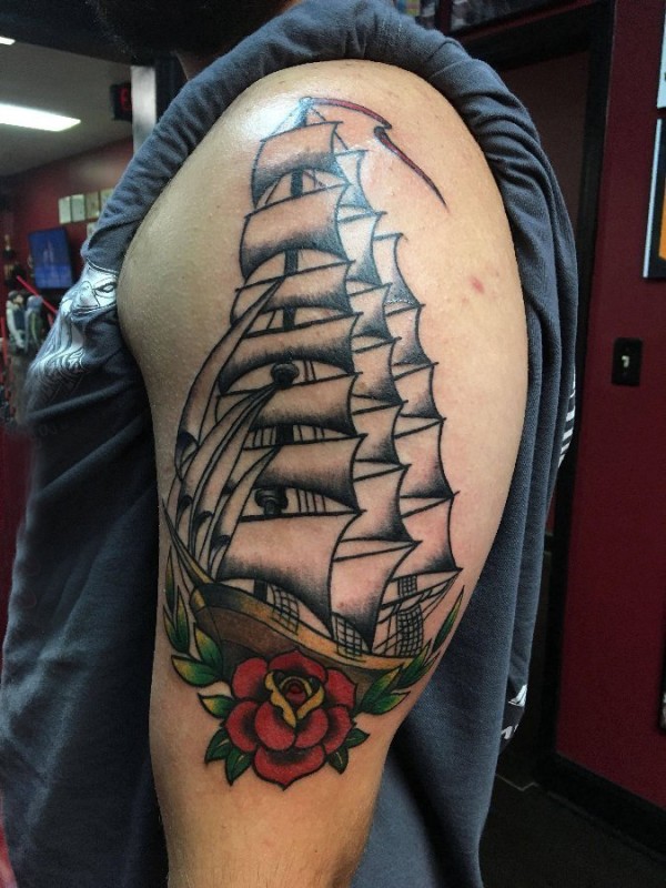 大臂纹身图 男生大臂上花朵和帆船纹身图片