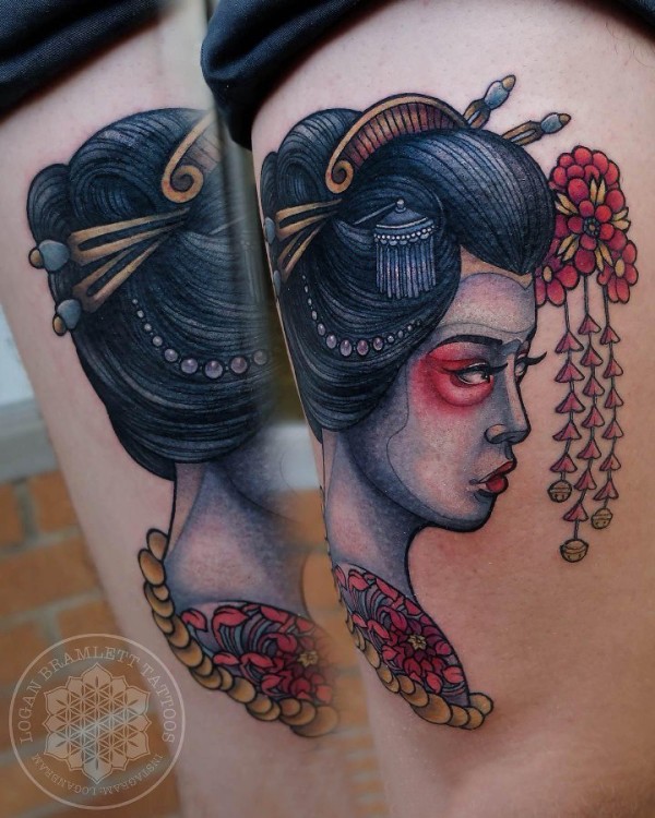 纹身日本艺妓 女生大腿上彩绘纹身日本艺妓图片