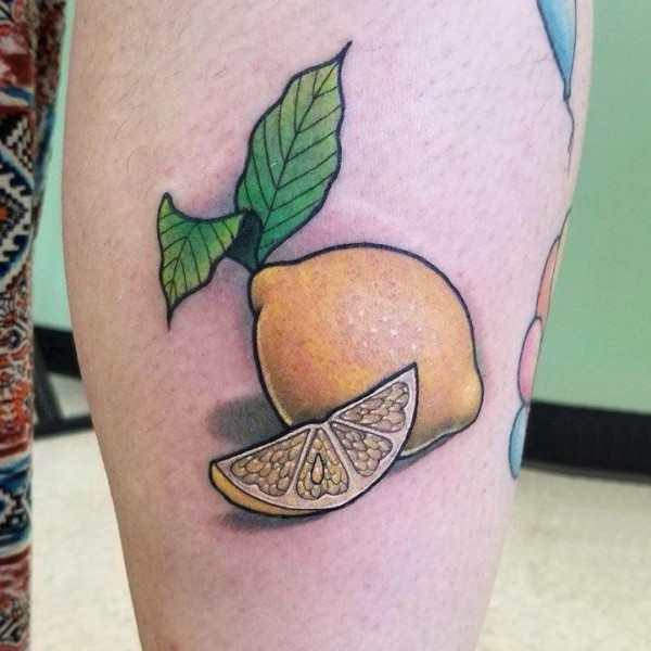 纹身柠檬水 女生大腿上彩色的柠檬纹身图片