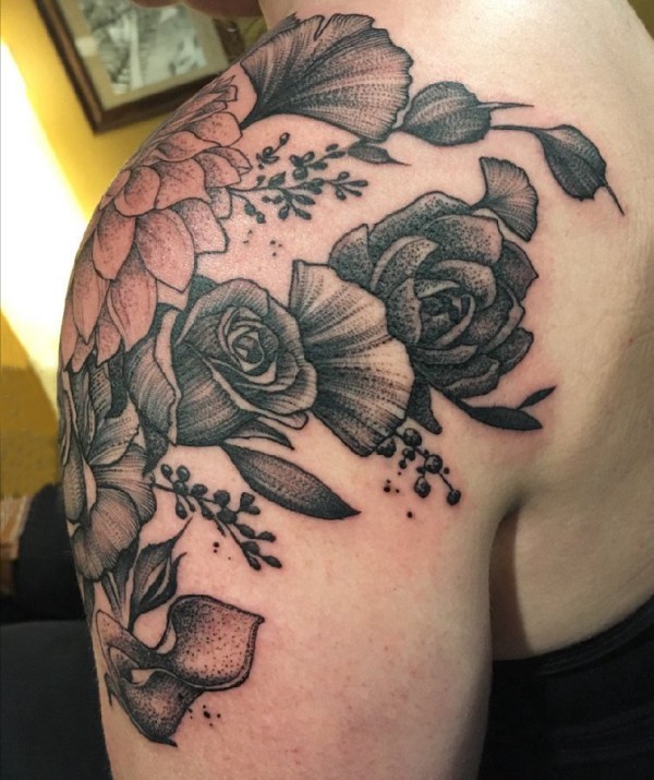 花朵纹身 女生肩部黑灰纹身花朵图案