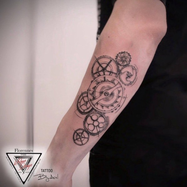 机械齿轮纹身 男生手臂上黑色的齿轮纹身图片