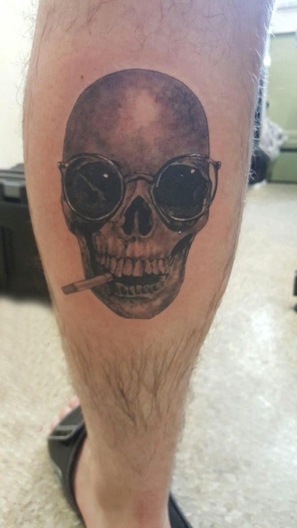 点刺纹身技巧 男生小腿上黑色的骷髅纹身图片