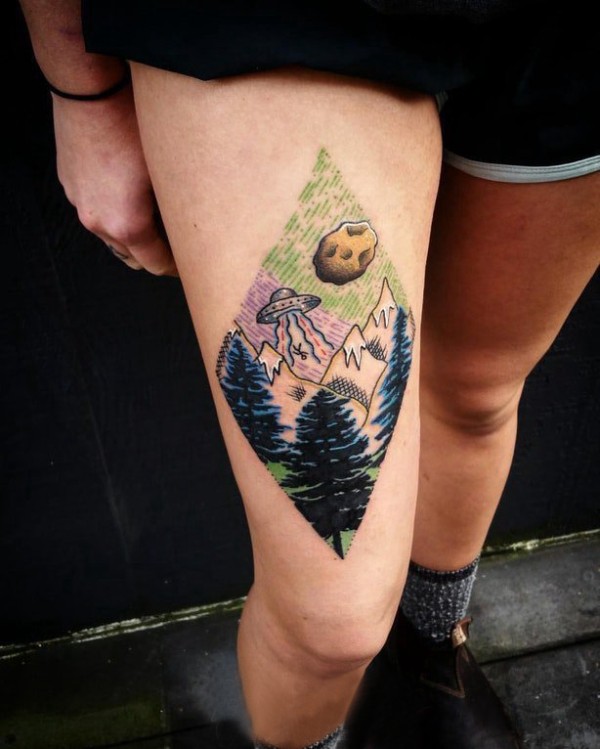 彩绘纹身 女生大腿上飞碟和风景纹身图片