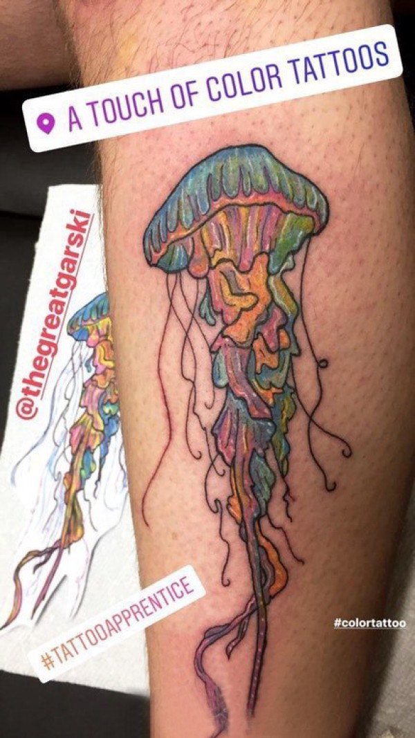 百乐动物纹身 男生小腿上彩色的水母纹身图片