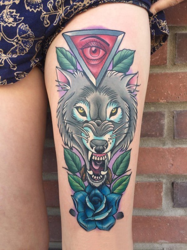 大腿纹身传统 女生大腿上狼头和玫瑰纹身图片
