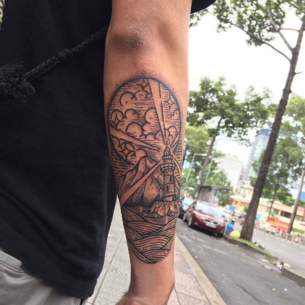纹身灯塔 男生手臂上黑灰纹身灯塔图案