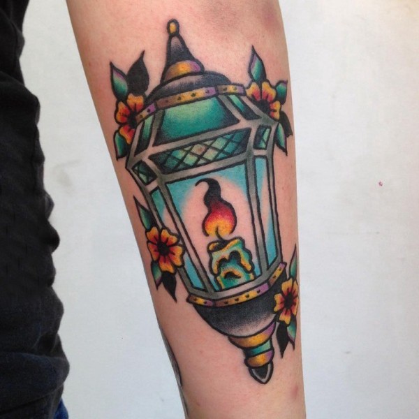 手臂纹身素材 男生手臂上花朵和灯纹身图片