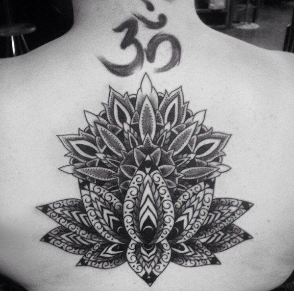 纹身后背女 女生后背上黑色的莲花纹身图片