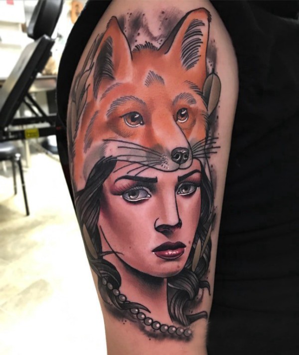 双大臂纹身 男生大臂上狐狸和人物肖像纹身图片