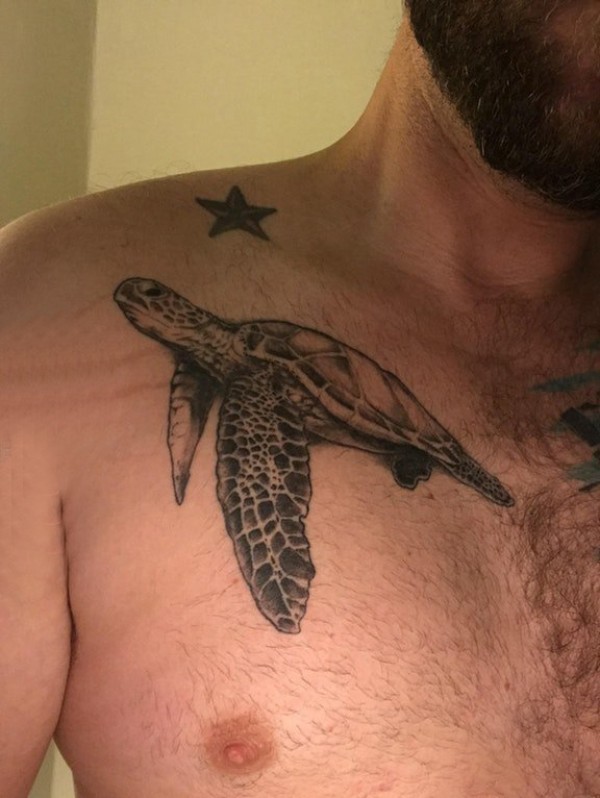 肩膀简约纹身 男生肩部五角星和海龟纹身图片