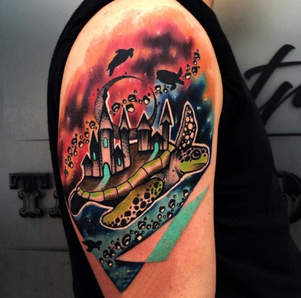 双大臂纹身 男生大臂上海龟和建筑物纹身图片