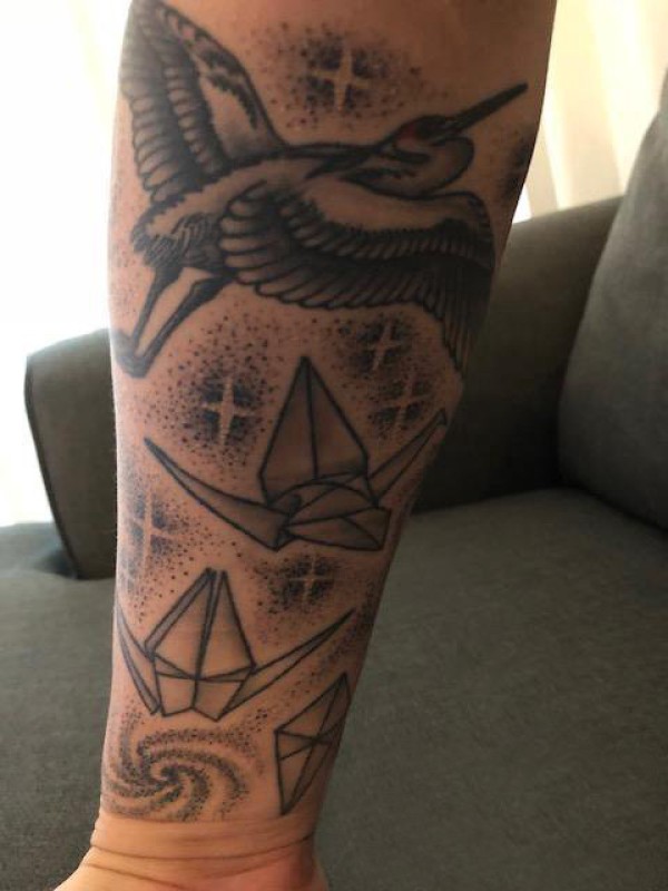 纹身黑色 男生手臂上白鹤和千纸鹤纹身图片