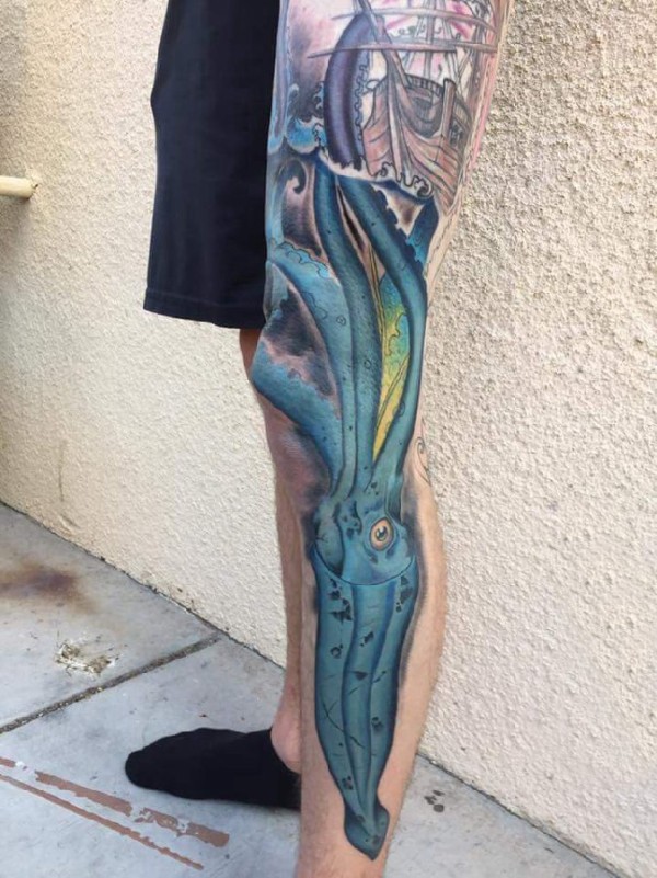 纹身腿部 男生腿部彩色的鱿鱼纹身图片