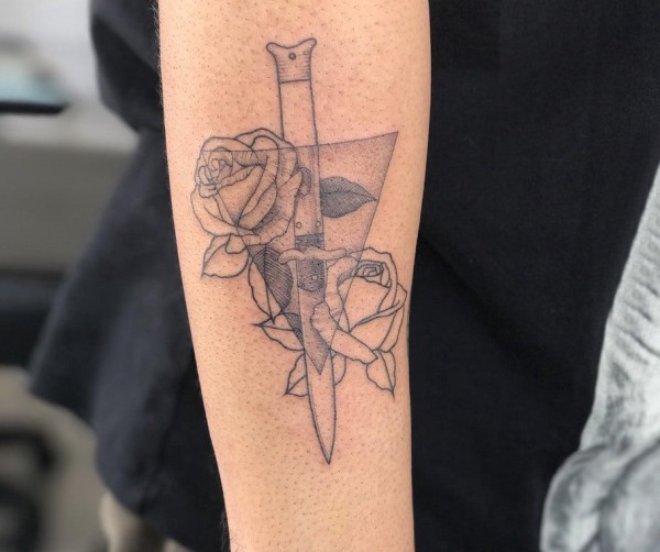 纹身手臂女生 女生手臂上三角形和玫瑰花纹身图片