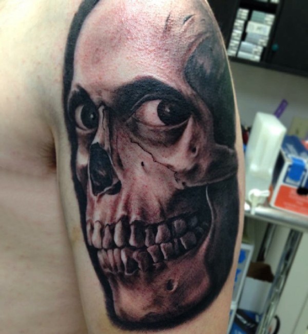 纹身骷髅头 男生手臂上黑灰纹身骷髅头图案