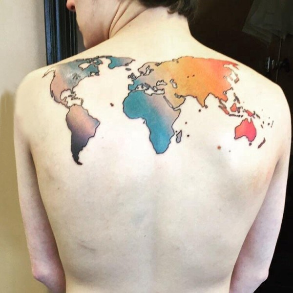 纹身世界地图 男生后背上彩色的世界地图纹身图片