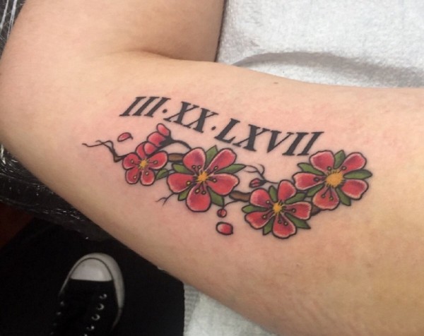 纹身手臂女生 女生手臂上罗马数字和花朵纹身图片
