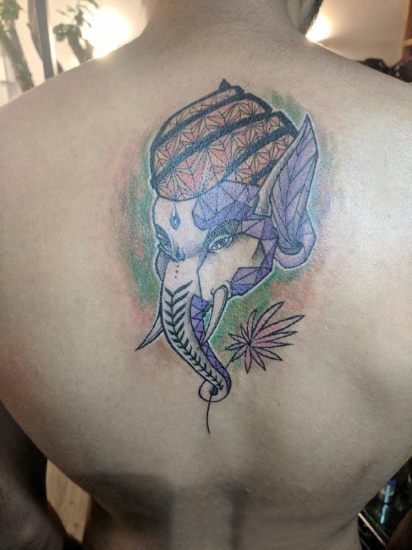 纹身象神图案 男生后背上彩色的象神纹身图片