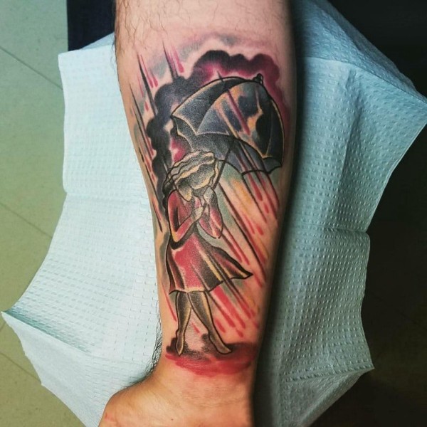 人物肖像纹身 男生手臂上雨伞和人物肖像纹身图片