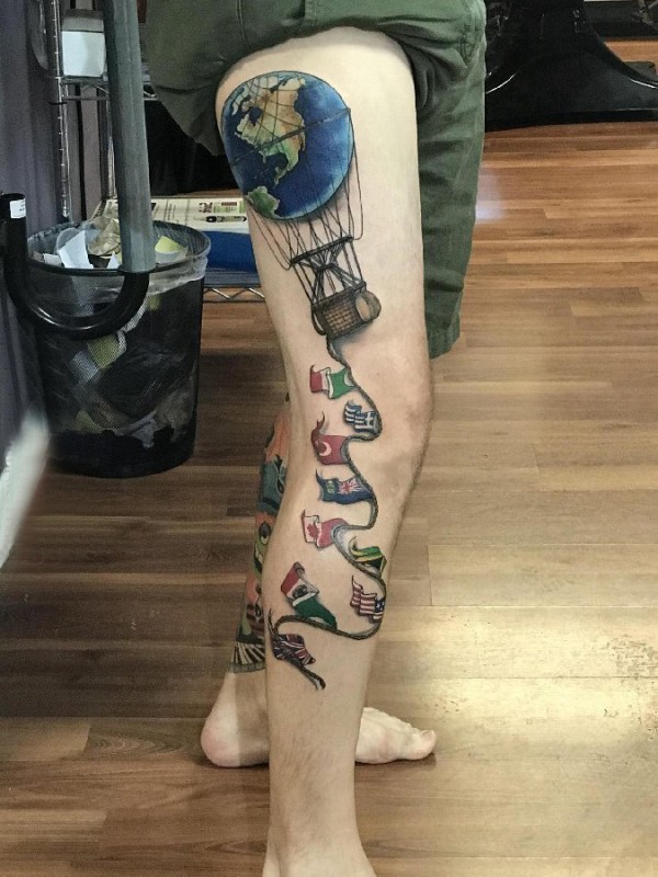 纹身腿部 男生腿部旗帜和热气球纹身图片