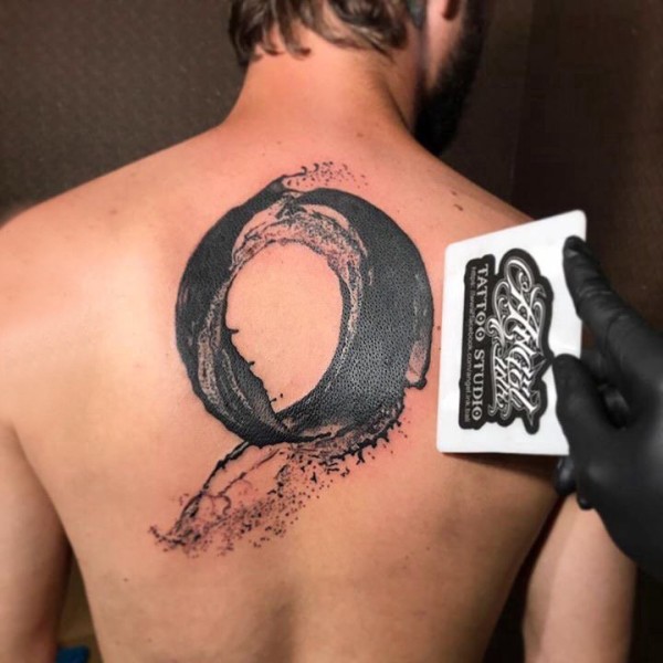 后背纹身男 男生后背上黑色的圆形纹身图片