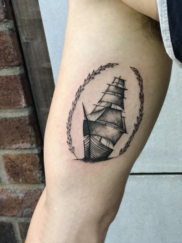纹身小帆船 男生手臂上黑灰纹身小帆船图片