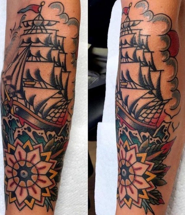 纹身小帆船 男生手臂上彩绘纹身小帆船图片