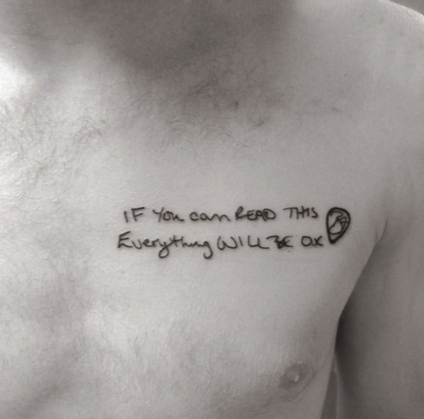 纹身胸部男 男生胸部黑色的花体英文纹身图片