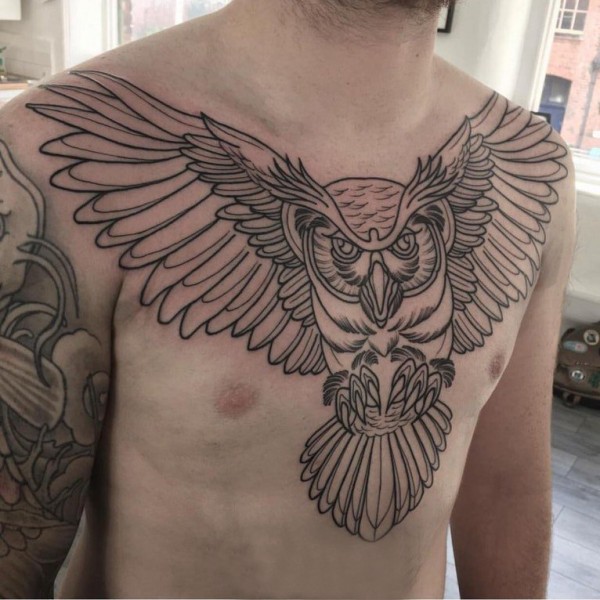纹身胸部男 男生胸部黑色的猫头鹰纹身图片