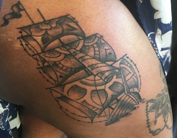 纹身小帆船 女生大腿上黑灰纹身小帆船图片
