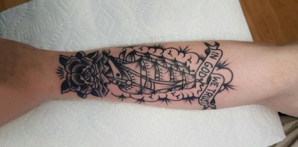 纹身小帆船 男生手臂上花朵纹身小帆船图片