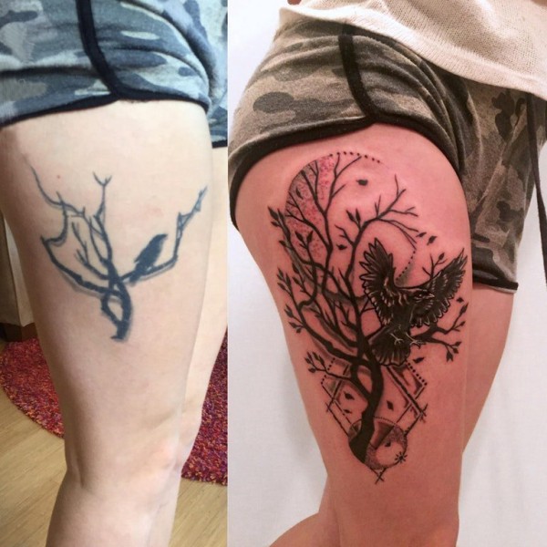 纹身覆盖 女生大腿上树枝和鸟纹身图片