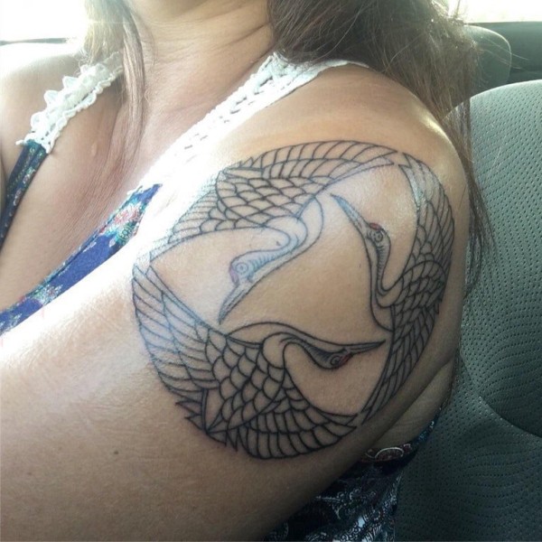 仙鹤纹身 女生大臂上黑色的仙鹤纹身图片