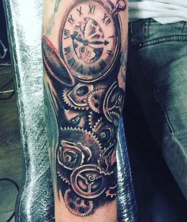 纹身钟表 男生手臂上机械齿轮纹身钟表图片