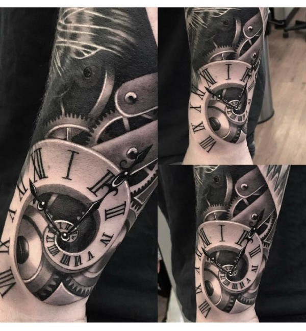 纹身钟表 男生手臂上黑灰纹身钟表图片