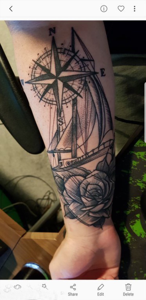 纹身指南针 男生手臂上花朵纹身指南针图片