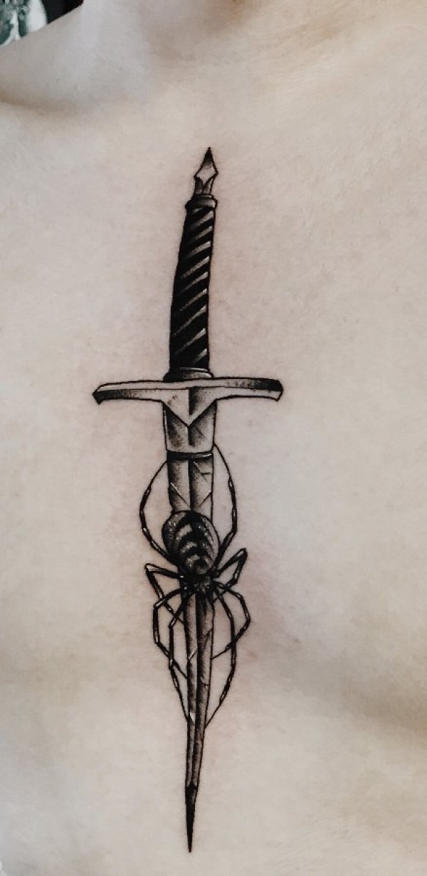 纹身胸部男 男生胸部蜘蛛和匕首纹身图片