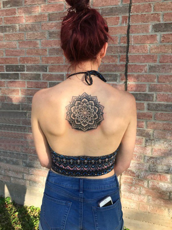 纹身后背女 女生后背上黑色的曼陀罗纹身图片