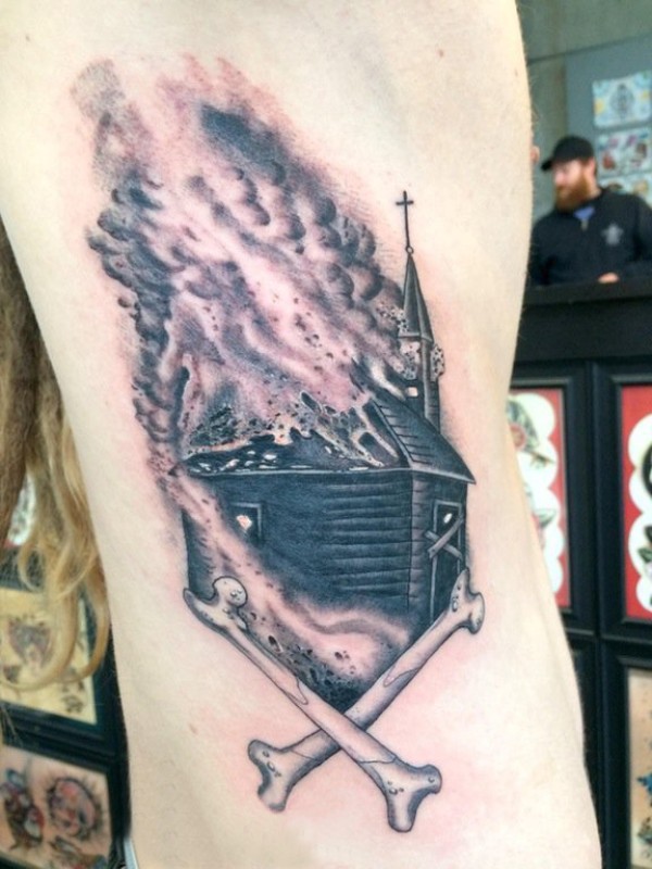 手臂纹身素材 男生手臂上火焰和建筑物纹身图片