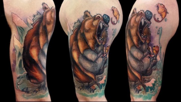 百乐动物纹身 男生大臂上鱼和熊纹身图片