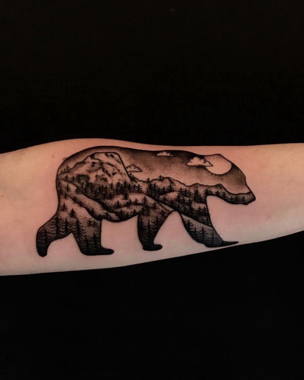 百乐动物纹身 女生手臂上熊和风景纹身图片