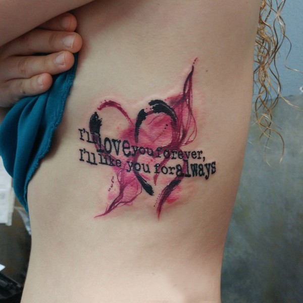侧腰纹身图 女生侧腰上心形和英文纹身图片