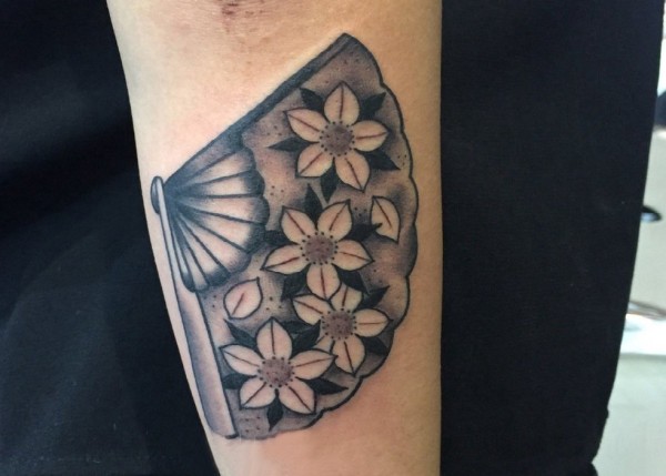 手臂纹身素材 男生手臂上花朵和扇子纹身图片